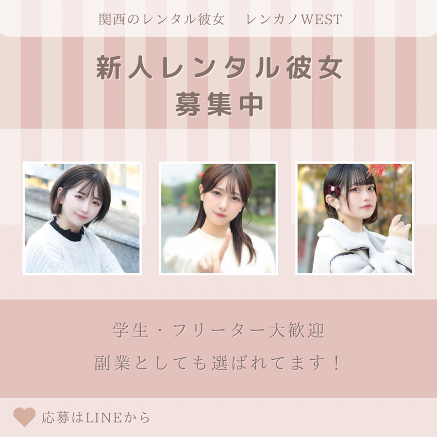 レンタル彼女とは、自分にとって理想の女の子と食事デートや映画館デート、水族館、テーマパークデートなどを通して素敵な時間を楽しめる恋人代行サービスです。関西のレンタル彼女「レンカノWEST」はレンタル彼女の厳選・質を重視しており、モデルやアイドル出身などビジュアルのレベルが高い女の子のみを派遣しております。当店の面接倍率は20倍ととても厳しく、それに合格したレンタル彼女のみを掲載しております。美少女と大阪を中心とした関西地方で素敵なデートをしてみるなんていかがでしょうか?