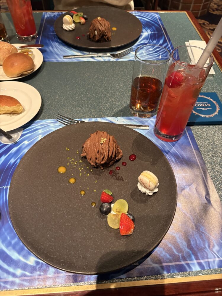 結構早いスピードで次の料理来る!😂そして食べてる途中で蘭&新一&園子との撮影タイムスタート!私たちはなんと1番目!ここで撮った写真も後で彼氏さんが購入してくれて、データをいただいた🥹ありがとう、めっちゃ素敵な写真だった❣️この写真は私たちだけの秘密♡